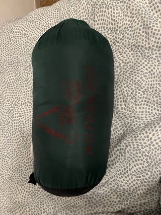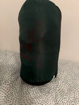 Sacco a pelo di colore verde scuro, ideale per le tue avventure all'aria aperta. - Modello ACTION 250 - Logo rosso stampato sul tessuto
