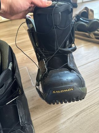 Scarponi da snowboard Salomon symbio in pelle nera. - Chiusura automatica. - Logo Salomon sul tallone. Malgrado i segno di usura, sono perfettamente funzionanti. I segni estetici sono dovuti all’umidità della neve e agli attacchi troppo stretti. Prezzo trattabile