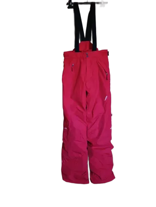 Pantaloni da sci Wed'ze rossi con bretelle regolabili. Taglia 14 anni o altezza 1.52/1.64 - Tessuto resistente, traspirente, isolante e impermeabile - Tasche con zip. - Bretelle nere.