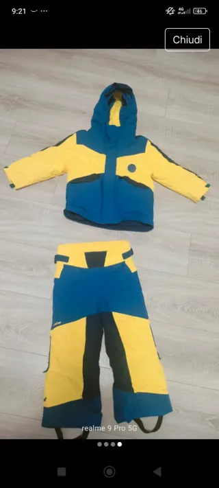 Tuta da sci per bambino, composta da giacca e pantaloni. - Colore blu e giallo. - Cappuccio integrato. - Tasche frontali.per 4 anni