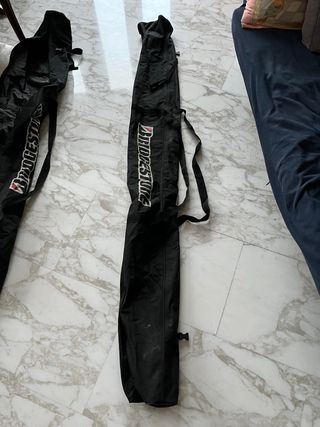 Sacca porta sci di colore nero, con logo Bridgestone. Lunga2 metri misure base 18x10 cm circa cursore come da foto - Materiale resistente. - Manici per il trasporto. - Chiusura con fibbia.