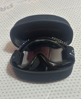 Elegante maschera da sci Blumarine, perfetta per le piste. - Lenti effetto specchio fumé - Dettagli scintillanti sul bordo. - 18 brillantini - Elastico regolabile nero con scritta Blumarine argento - Completa di custodia rigida protettiva con ligi Blumarine Nuovo mai usato manca solo la copertura superiore e inferiore vedi foto
