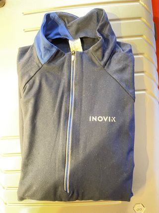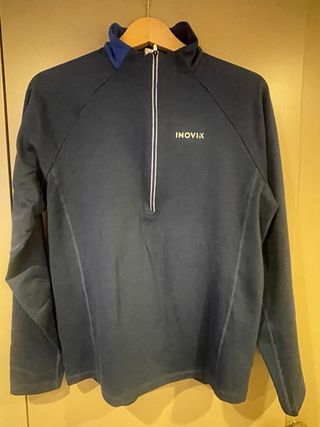 Maglia tecnica Inovik di colore blu navy. - Collo alto grigio. - Zip frontale con dettaglio arancione. - Logo Inovik sul lato. - Taglia XL