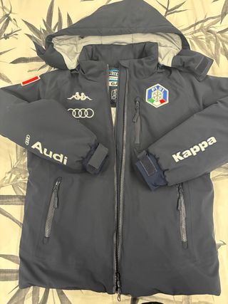 Completo da sci Kappa originale, composto da giacca e pantaloni. - Giacca blu scuro con logo Kappa e Audi. - Dettagli FISI (Federazione Italiana Sport Invernali). - Pantaloni blu elettrico con logo Kappa. - Zip frontale e tasche con zip.