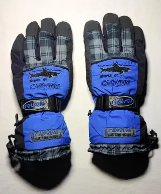 Guanti da sci Reusch allungati, felpati internamente caldissimi,palmi con grip antiscivolo,doppia regolazione , taglia 8 1/2 usati poco e con cura - Stampa Sharks Go Carving sul dorso. - Logo Reusch sul polso. - Polsini regolabili con chiusura a velcro. - Fantasia a quadri sul bordo del polsino.