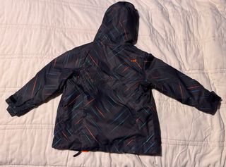 Giacca da sci per bambino marca Wedze, adatta per 6 anni. Presenta un design con fantasia a righe colorate su sfondo scuro e fodera interna arancione. - Fantasia a righe multicolore. - Fodera interna arancione vivace. - Cappuccio integrato.