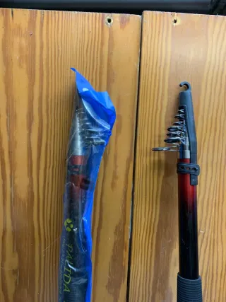 Set composto da due canne da pesca telescopiche e un mulinello. - Colore canne: rosso sfumato nero. - Materiale impugnatura: gomma.
