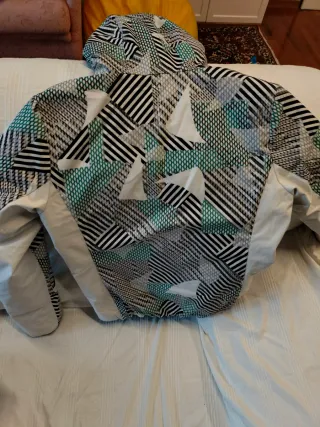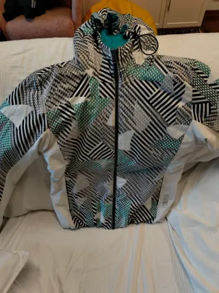 Giacca da sci Colmar da donna, taglia 44. Presenta un design con fantasia geometrica. - Fantasia geometrica multicolore. - Dettagli bianchi sui lati e sulle maniche. - Interno in colore turchese.
