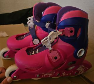 Vendo un paio di pattini in linea rosa, perfetti per iniziare a pattinare. Sono in buone condizioni. - Colore rosa e viola - Chiusura con fibbie - Ruote in buone condizioni