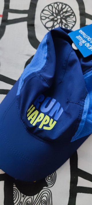 Cappellino sportivo blu con scritta 'Run Happy'. Perfetto per le tue corse! - Colore blu - Scritte colorate - Tessuto traspirante