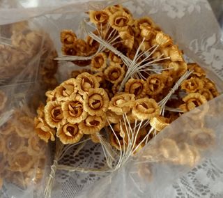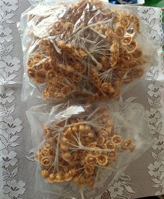 Bellissimi fiorellini finti color oro, perfetti per decorazioni o bomboniere. Sono in confezioni, come mostrato in foto. - Circa 730 fiorellini. - Colore oro. - Materiale: tessuto. - Perfetti per creare delle bomboniere fai da te.