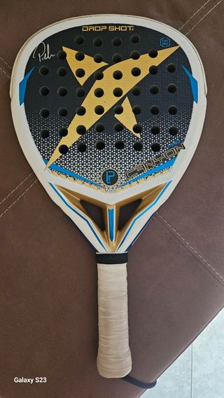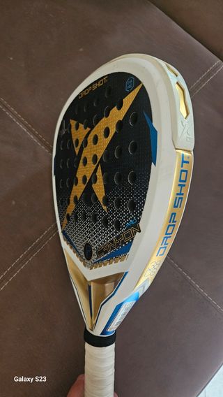 Racchetta da padel Drop Shot Canyon, modello utilizzato da Pablo Lima. - Design con fulmine dorato e dettagli blu. - Logo P al centro. - Impugnatura avvolta in nastro bianco.