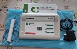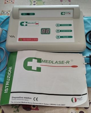 Massaggiatore a laser MEDLASE-R, ideale per trattamenti. - Dispone di display digitale. - Pulsanti per Program, Start/Stop e Pulse. - Include manipolo e cavo di alimentazione. - Presente interruttore ON/OFF. Utilizzato due volte