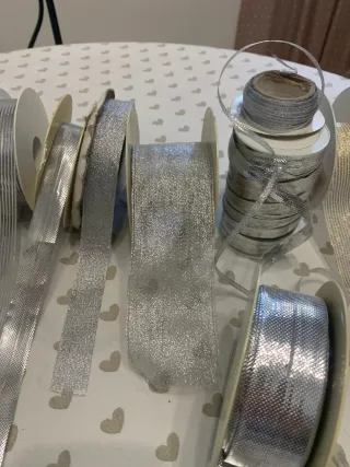 Set di nastri passamaneria in colore argento. - Nastri con diverse trame e finiture metalliche. - Ideali per decorazioni e lavori creativi.