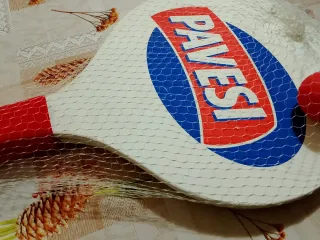 Set di racchette Pavesi con pallina inclusa, perfette per il gioco. - Racchette bianche con logo Pavesi. - Manici rossi. - Pallina rossa.
