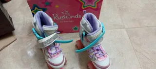 Pattini a rotelle per bambini, con possibilità di regolare la misura. Misura L che corrisponde a una 31/35. Da notare una macchia,e un laccio rovinato, osservare le foto. Poco utilizzati. Presentano segni di utilizzo. Le ruote si illuminano durante il movimento. - Marca: Runcinds.