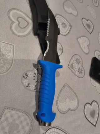 Coltello subacqueo con lama seghettata e impugnatura blu. - Lama in acciaio. - Impugnatura ergonomica in gomma blu. - Fodero incluso.