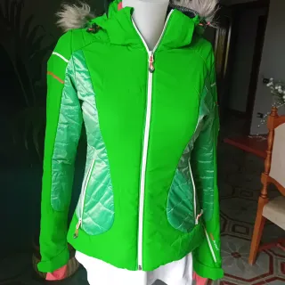 Giacca da sci di colore verde brillante, ideale per le attività invernali. - Cappuccio con pelliccia sintetica. - Zip centrale a contrasto bianco. - Inserti trapuntati sui fianchi e sulle maniche. - Dettagli a contrasto rosa e bianchi.cerniere sotto le ascelle