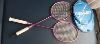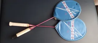Set di due racchette da badminton con custodie. - Racchette con manici bianchi e dettagli in bordeaux. - Stecche di colore viola. - Custodie blu con logo. - Chiusura con cerniera nelle custodie. Una delle racchette necessita di una riparazione delle corde, per questo il prezzo.
