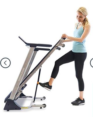 Tapis roulant pieghevole Horizon Fitness T-R01. È come nuovo, è un tapis roulant che una persona anziana usava solo per camminare. La sua lunghezza quando è piegata è di 78 cm. È in vendita su Decatlon, nel caso in cui desideri vedere le funzionalità.