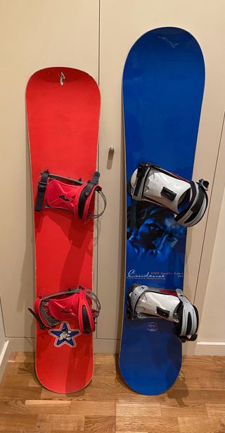 2 tavole da snowboard, una blu e l'altra arancione - Include attacchi. - Design con dettagli in rosso e bianco. È possibile utilizzare la tavola, ma gli attacchi devono essere sostituiti, sono rotti, 1,5 metri.
