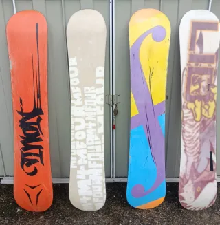Set di quattro tavole da snowboard con design vari. Taglia 154