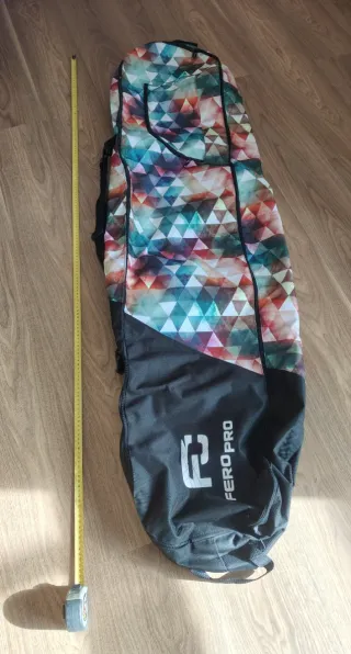 Fondello per tavola da snowboard con un design geometrico multicolore molto accattivante. La parte inferiore è di colore nero. Capacità per tavole fino a 160 cm. Cinturino regolabile per appendere. Può essere appeso anche come zaino. Marca: FERO PRO.