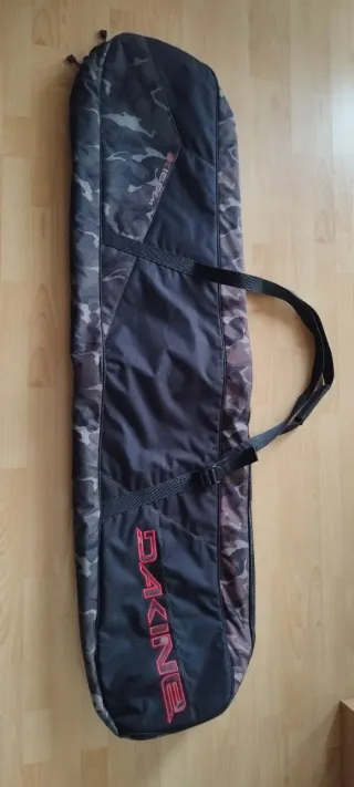 Fodero per snowboard DAKINE, adatto per tavole fino a 165 cm. Interno termico/isolante con fodera argentata e imbottitura per proteggere la tavola da urti, sfregamenti e umidità. Cerniera completa e maniglie di trasporto resistenti. Design camouflage nero/grigio con logo rosso. In buone condizioni, cerniere e cuciture perfette. Ideale per il trasporto, i viaggi o per riporla fuori stagione.