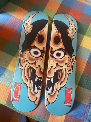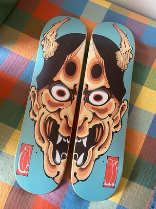 Coppia di tavole da skate con un design accattivante e artistico. Design con volto demoniaco e corna. Colori vivaci e dettagli nitidi. Base blu chiaro. Include due tavole.