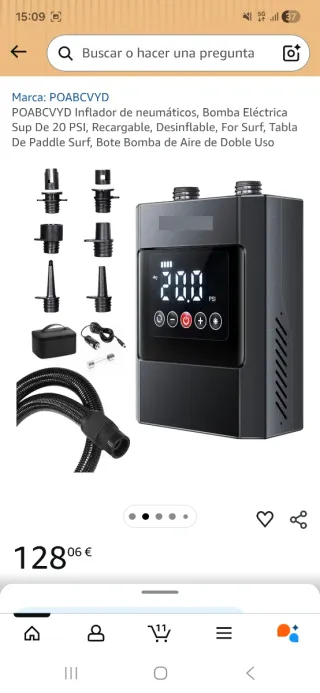 Gonfia la tua tavola facilmente, inflatore elettrico con connessione alla presa di corrente dell'auto. Di colore blu, progettato per gonfiare tavole da surf e altri articoli gonfiabili. - Schermo digitale. - Pulsanti di controllo (+/-). - Pulsante di accensione/spegnimento. - Tubo flessibile.