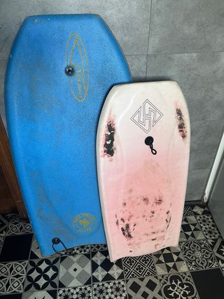 Sono due tavole diverse, la rossa🔴 e la blu🔵, generalmente in buone condizioni (usate ma non eccessivamente). La rossa🔴 è in buone condizioni. La blu🔵 è in buone condizioni, sul lato sinistro c'è un gonfiore d'aria ma può essere rimosso facilmente svitando uno dei bulloni di plastica. Entrambe le tavole sono dotate di leash e pinne.