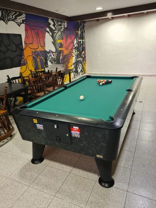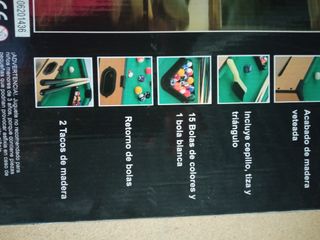 In vendita il biliardo spagnolo o la caranbola con tutti gli accessori tranne l'orologio, che non è incluso. Tavola con dimensioni esterne 1,32x2,40. È facilmente smontabile per il trasporto, la base è composta da 3 pietre di ardesia, che ne facilitano il trasporto. Il tappeto è appena stato cambiato. Viene fornito con tutti i suoi accessori, come palline, bastoncini, pennarello, porta tacos e una scatola di gessetti. Una delle pietre è rotta, ma non ci sono problemi, non è evidente né influenzata dal suo funzionamento o dalla sua resistenza.