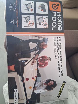 Trasforma il tuo tavolo in un tavolo da biliardo con questo accessorio. Si adatta a qualsiasi tavolo della casa e lo trasforma in un divertente tavolo da biliardo. Utilizzato molto poco. - Per tavoli da 95-220 cm - Regolabile fino a tavoli da 75-120 cm. - Diametro 110-230 cm.