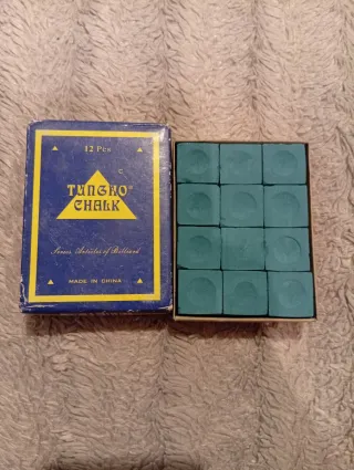 Caja completa de tiza para taco de billar de la marca TUNGHO, conocida por ser un producto estándar y fiable. • Cantidad: 12 cubos (Piezas nuevas, sin usar). • Color: Azul/Turquesa (ideal para paño verde). • Modelo: "KING" / "SUPER QUALITY". • Esta tiza proporciona un excelente agarre a la punta del taco, ayudando a prevenir pifias y a aplicar mejor el efecto. • Ideal para: Jugadores de Pool, Billar Americano y Snooker que busquen material económico y funcional. Perfecta para mesas domésticas o bares. • Estado: Los cubos están en perfecto estado, como se ve en las fotos. La caja contiene las 12 unidades originales.