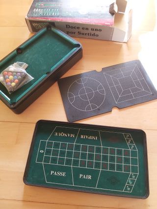 Dodici giochi in una sola scatola. Roulette, scala, Blackjack, carte, domino, scacchi, dama, dama cinese, biliardo, chaquete, cornice. Senza utilizzo. In perfette condizioni. La scatola presenta piccoli graffi agli angoli come si vede nelle foto, ma i giochi sono perfetti. Dimensioni 30 cm di lunghezza per 17 cm di larghezza. I tavoli da gioco sono i coperchi della scatola interna in cui sono conservati e sui quali si gioca. Ad eccezione del biliardo e di alcuni altri giochi che hanno un tavolo separato. Ritiro a mano ad Azucarera del Arrabal de Zaragoza, Zona Joven del ayuntamiento della città o spedizione tramite Wallapop.