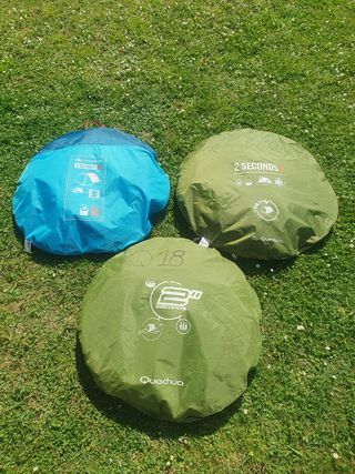 Vendo 3 tende da campeggio "2 seconds 3" di Quechua con capacità per 3 persone. Tutte hanno la parte esterna come si vede nelle immagini, corde e picchetti ma manca la parte interna e la zanzariera. Una è praticamente nuova e le altre un po' usate. Vendo ciascuna a 30 euro, se si acquistano tutte le lascio a 80€. Prezzi negoziabili