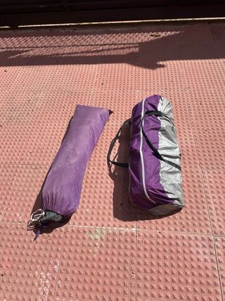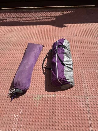 In vendita due tende da campeggio del marchio Quechua. Ideali per le tue uscite all'aperto. Una per due persone e l'altra per 4-5 persone. 20 euro ciascuna. Colore: Viola e marrone. Chiusura con cerniera. Include maniglie per il trasporto.