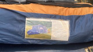 Tenda spaziosa con design a tunnel. Usata un giorno. - Colore blu e grigio. - Porta frontale con cerniera. - Finestre laterali. - Include aste e tende.