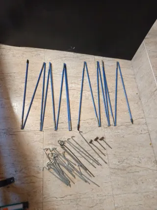 Set di pali smontabili per tende da campeggio. Facili da trasportare e montare. Materiale: alluminio e plastica. Colore: nero e argento. Include corde di fissaggio. 10€ per lotto.