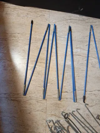 Set di pali per tenda da campeggio, ideali per tende o tende da sole. Sono di colore blu e sono accompagnati da picchetti. Caratteristiche: - Aste in alluminio o fibra di vetro. - Picchetti metallici per il fissaggio al terreno. - Design leggero e portatile.