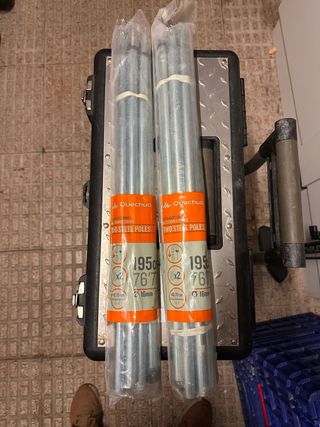 Set (2) di due aste (4 in totale) in acciaio del marchio Quechua, ideali per tende da campeggio, tende, tettoie, tende da sole. Lunghezza: 195 cm. Diametro: 16 mm. Materiale: Acciaio. Nuovi da aprire.