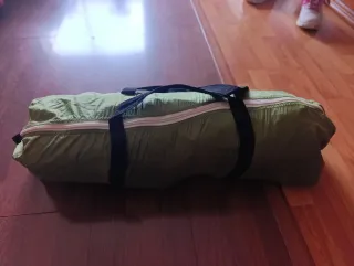Tenda da campeggio facile da montare per 3-5 persone. Usato pochissimo, come nuovo, solo una cerniera rotta da un lato che può essere riparata senza problemi. Colore beige. Porta con zanzariera. Include aste e tende.