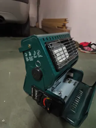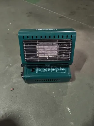 Stufa portatile a gas della marca Marksman in colore verde. Design compatto e facile da trasportare. Griglia protettiva frontale. Ideale per camper, tende da campeggio o roulotte. Poco uso e in buone condizioni.