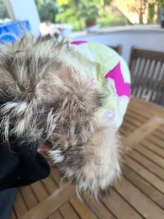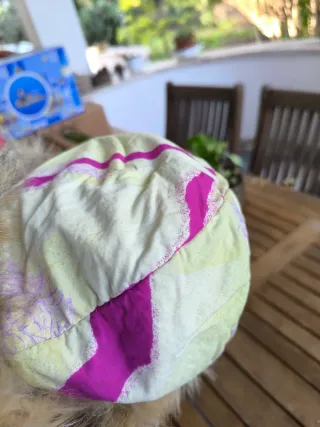 Cappello da neve con un design colorato e dettagli in pelliccia. - Fantasia con macchie fucsia e disegni viola. - Bordatura in pelliccia sintetica.