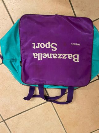 Borsa sportiva multiuso con un design vivace. - Colore principale viola con inserti turchesi. - Manici resistenti per il trasporto. - Logo Bazzanella Sport e TRENTO stampati sul fronte.