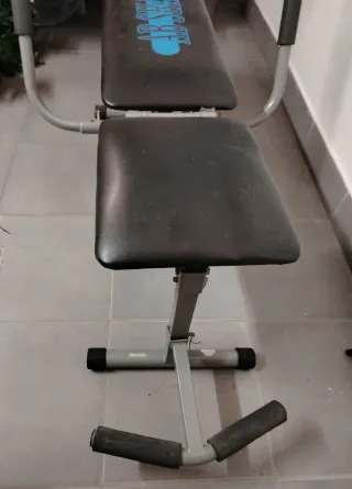 Panca per addominali in ottime condizioni, praticamente nuova. - Struttura robusta in metallo grigio. - Seduta e schienale imbottiti neri. - Maniglie nere per appoggio.