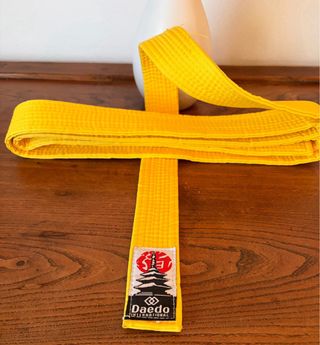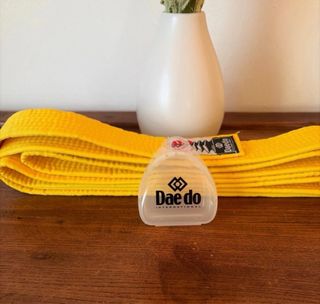 Set per Taekwondo composto da una cintura gialla e un paradenti. - Cintura in tessuto resistente. - Paradenti di protezione.