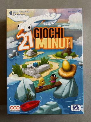 Gioco da tavolo 21 Giochi Minuti di Matteo Teooh! Boca e P. S. Martensen, illustrato da Sara Gloria. Edizione italiana - Edizione GateOnGames / Post Scriptum. - Tema: isole, mare e personaggi stilizzati.