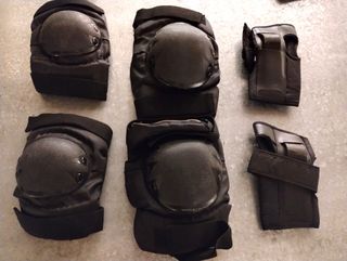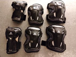Set di protezioni per attività sportive. - Protezioni per ginocchia e gomiti. - Protezioni per polsi. - Materiale resistente e imbottito.