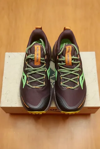 Scarpe da trail running Saucony Xodus Ultra 2 da donna, colore viola. - Logo Saucony a contrasto. - Lacci verdi. - Dettagli arancioni sulla linguetta.